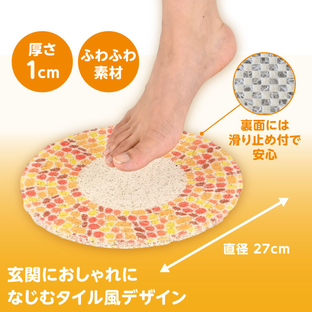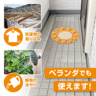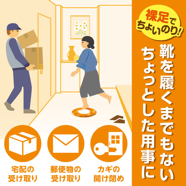 郵便物や宅配の受け取り、鍵の開け閉めなど、ちょっとした用事をストレスなく済ませるずぼらマット。玄関に1枚置いておくだけで靴やサンダルを履かなくても、裸足でちょちょいと用事を済ませることができます。直径27cmの大きめサイズなので、足がはみ出たりバランスを崩したりすることなく安定姿勢で受け取り可能。柔らかい素材をつかっているため踏み心地も◎
