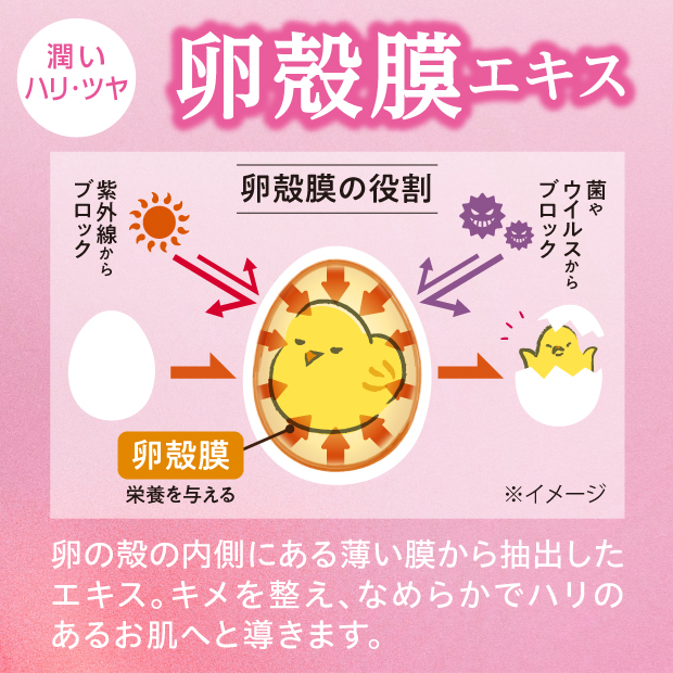 ●卵殻膜エキス、その他美容成分配合で、ふっくらツヤ肌
