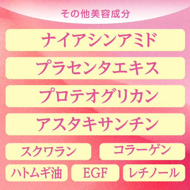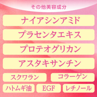●成分/ミネラルオイル、(ブチレン/エチレン/スチレン)コポリマー、パルミチン酸イソプロピル、酢酸トコフェロール、アスタキサンチン、ハトムギ油、ヒトオリゴペプチド-1、アセチルヒアルロン酸Na、スクワラン、加水分解卵殻膜、ナイアシンアミド、プラセンタエキス、パルミチン酸レチノール、ヒアルロン酸Na、水溶性プロテオグリカン、加水分解コラーゲン、オリーブ果実油、テトラヘキシルデカン酸アスコルビル、セラミドNP、コーン油、BG、トリ(カプリル酸/カプリン酸)グリセリル、水添レシチン、コレステロール、キサンタンガム、ココイルサルコシンNa、エタノール、水、トコフェロール、フェノキシエタノール
