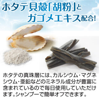 原料はホタテの貝殻。ミネラル成分(マグネシウム、亜鉛、カルシウム)が豊富に含まれます。